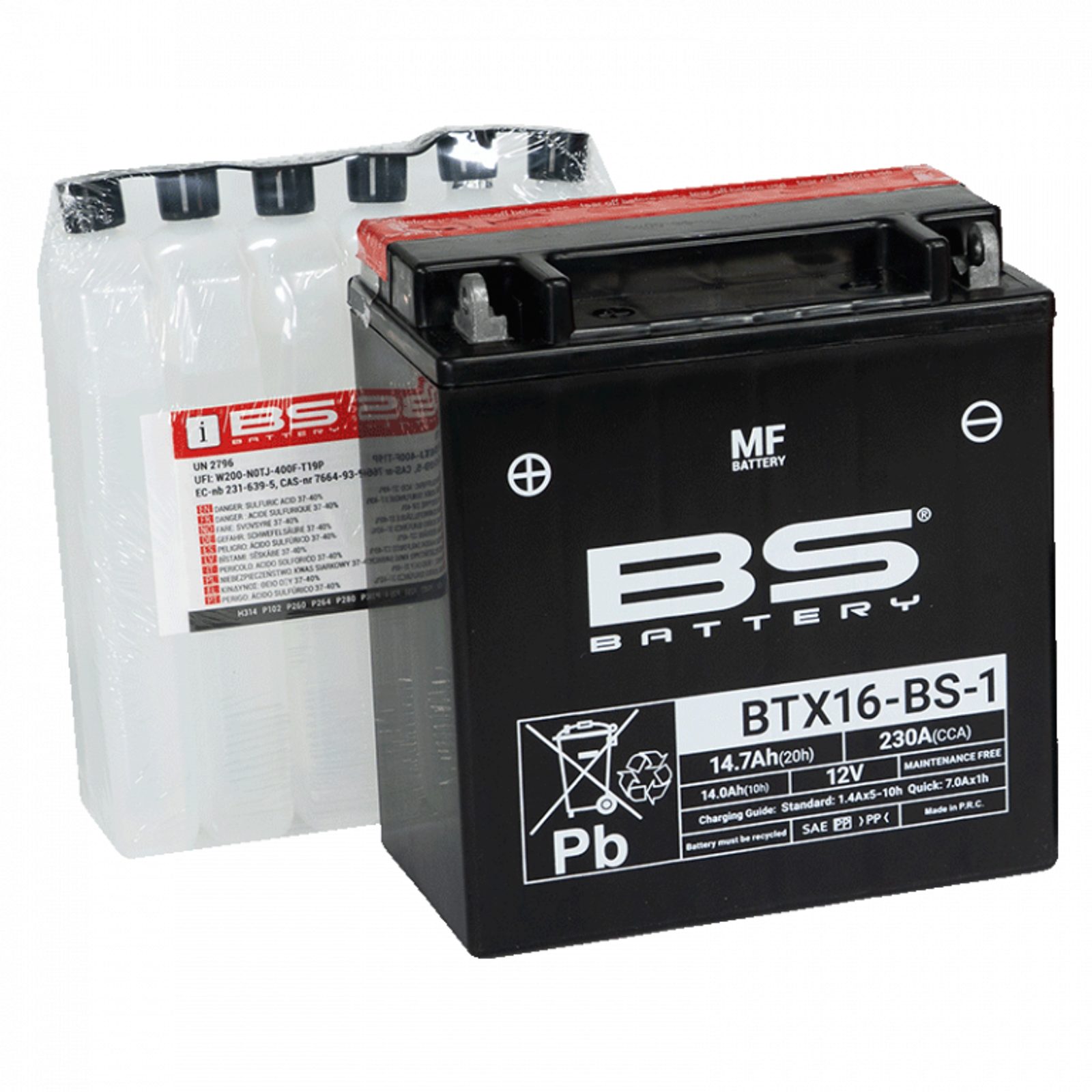 Baterie BTX16-BS-1 je součástí naší bezúdržbové MF řady. Tato 12V 14.7Ah baterie se dodává s balením elektrolytu (kyseliny) a před prvním použitím je nutné ji aktivovat nalitím kyseliny.