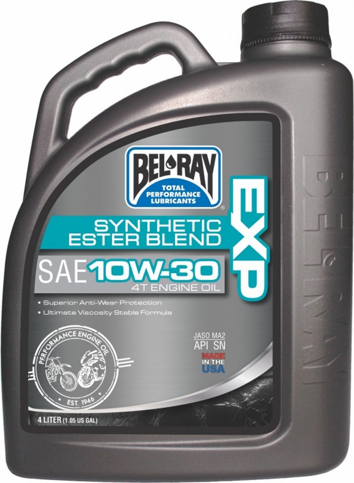 Bel-Ray EXP Synthetic Ester Blend 4T Engine Oil je motorový olej pro čtyřtaktní motocykly, který kombinuje syntetické oleje nejvyšší kvality s vybranými minerálními základovými oleji, aby zajistil nejvyšší úroveň ochrany pro všechny čtyřtaktní motocykly. Obsahuje střižně stabilní zlepšovače viskozitního indexu, které zabraňují poklesu viskozity. Splňuje výkonnostní požadavky API SN a JASO MA2. Je vhodný pro vzduchem i kapalinou chlazené čtyřtaktní motory a pro mokré spojky.