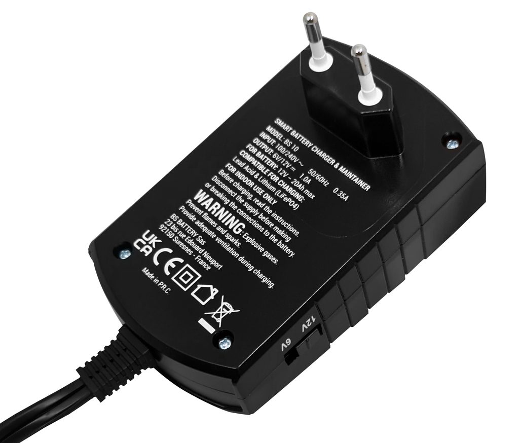 BS Charger BS 10 je automatická chytrá nabíječka a udržovací zařízení pro olověné a lithiové baterie s napětím 6 V / 12 V a nabíjecím proudem 1 A. Díky kompaktnímu a lehkému provedení je ideální na cesty a je vhodná pro akumulátory s kapacitou až 20 Ah.