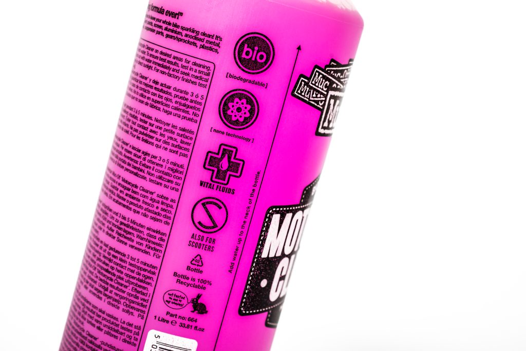 Díky našemu nejmodernějšímu složení Nano Tech čistič motocyklů Muc-Off Nano Tech pročistí nečistoty rychleji, než řeknete "OMG!", bez ohledu na počasí nebo jízdní podmínky. Tento klasický růžový čistič motocyklů má neuvěřitelnou čisticí sílu, protože obsahuje naši revoluční technologii Nano, která rozkládá nečistoty a špínu na mikroskopické úrovni a zároveň pečuje o jemný povrch vašeho motocyklu. Protože používáme ty nejlepší přísady a povrchově aktivní látky, je naše složení Muc-Off přísně střeženým obchodním tajemstvím.
