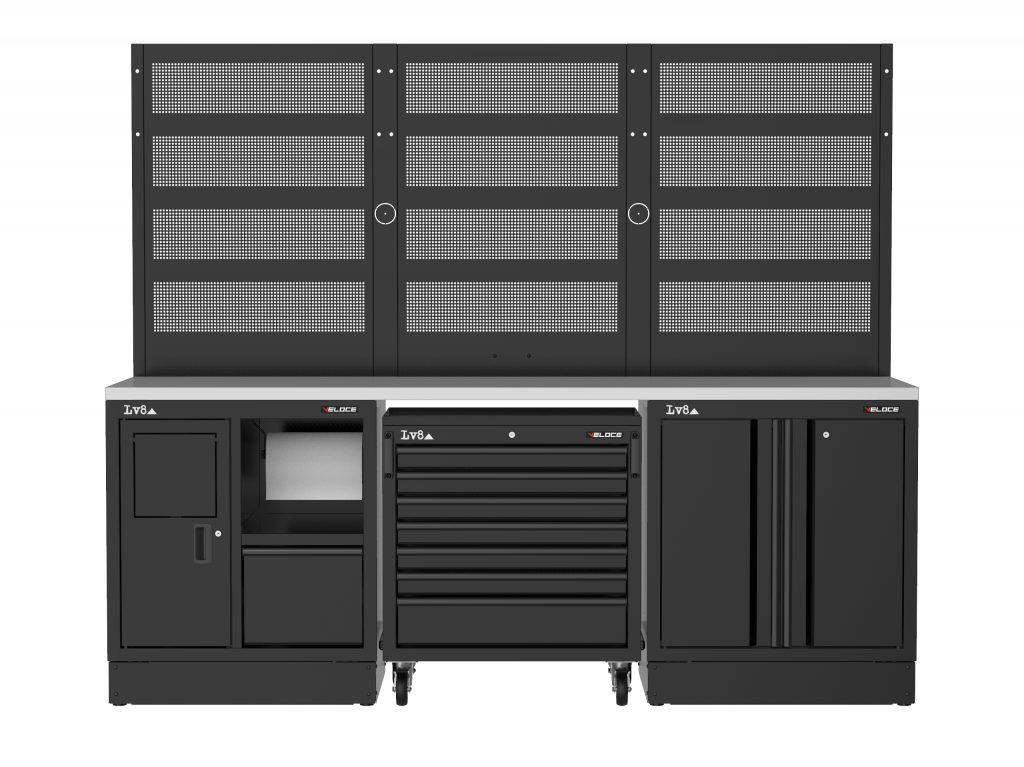 Pracovní stůl délky 2400 mm se servisní skříňkou (držák na papír a úložná zásuvka), 7 zásuvkovým pojízdným vozíkem a dvoudveřovou skříňkou s nastavitelnou policí a zámkem. Masivní dřevěná pracovní deska, tři perforované panely na nářadí a příprava pro elektrickou zásuvku. K dispozici také ve variantě s nerezovou nebo melaminovou deskou.