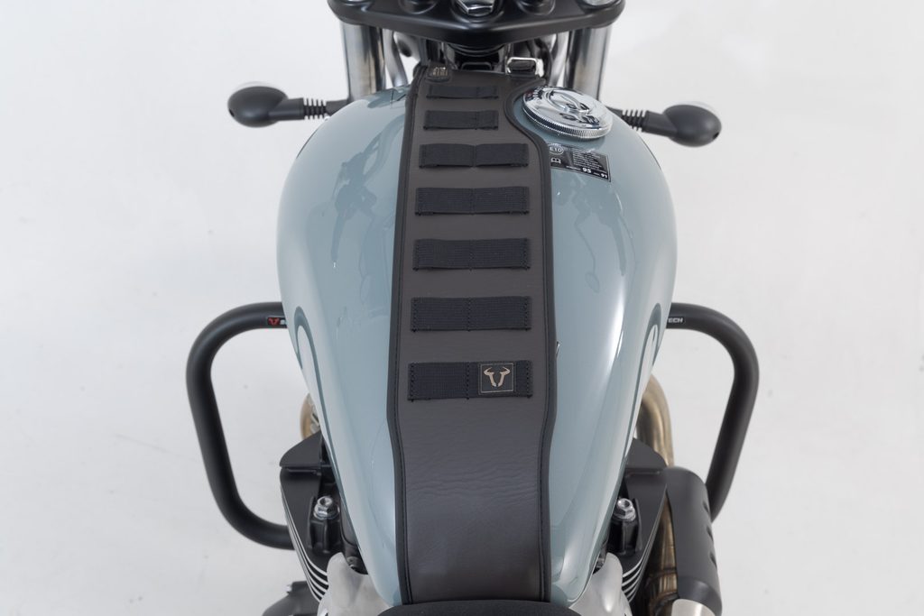 Vintage styl legendy Gear SLA tank popruh přidá jedinečný vzhled motocyklu. Určeno pro Triumph Bonneville T120, Street Twin, Thruxton 1200. Vojenský stupeň systém uchycení zajišťuje pružný a bezpečný držák legenda příslušenství čtyřokruhový jistící ventil.