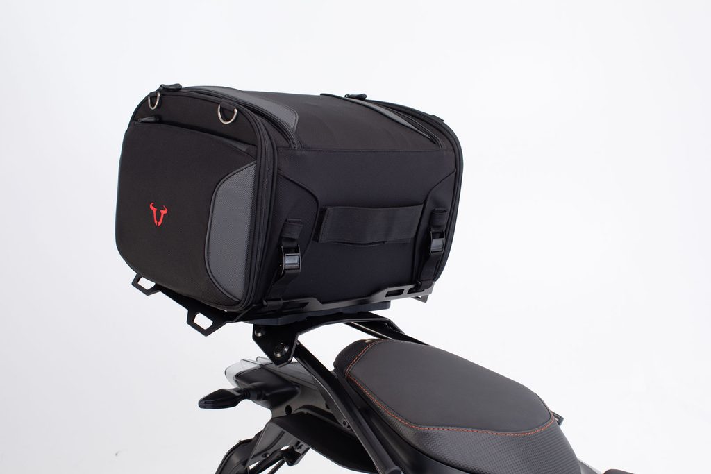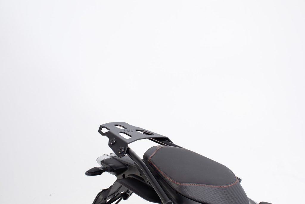 Bezpečná přeprava širokých zavazadel a rolí zavazadel: stabilní prodloužení téměř zdvojnásobuje velikost kontaktní plochy adaptérové desky STREET-RACK. Mnoho upevňovacích bodů a vyvýšené prvky v přední a zadní části rozšíření jsou ideální pro bezpečnou montáž objemných zavazadel. Černý práškový lak chrání hliníkovou konstrukci před korozí a dodává jí atraktivní vzhled. Pro připevnění adaptérové desky k STREET-RACK nejsou potřeba žádné nástroje. Adaptérová deska se jednoduše nasune na stojan a bezpečně se uzamkne pomocí otočné vačkové západky. Po jízdě lze desku adaptéru během několika sekund vyjmout a na motocyklu zůstane pouze nosič.