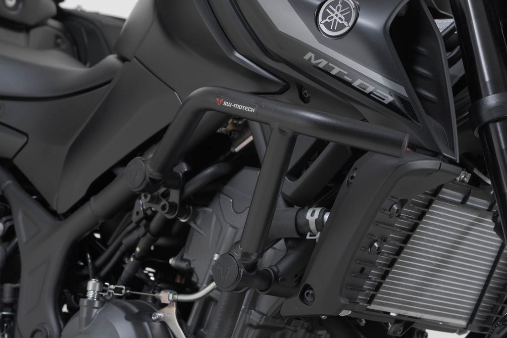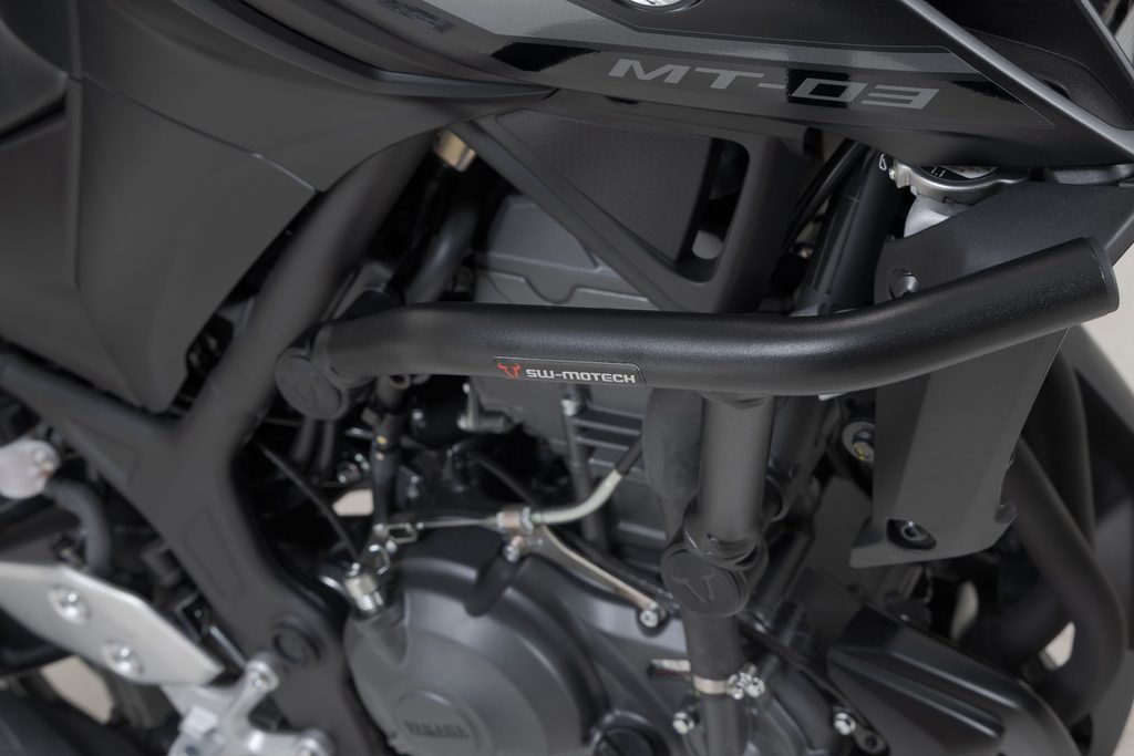 Větší bezpečnost v případě pádu nebo kolize: robustní boční nárazový rám s průměrem trubky 27 mm nabízí spolehlivou ochranu součástí, nádrže a kapotáže. Ochranný protektor, který byl speciálně navržen pro model MT-03, je připevněn k montážním bodům na původním rámu. Tím je dosaženo vysokého stupně stability. Pro montáž není nutné svařování ani vrtání. Černý práškový lak chrání trubkovou ocelovou konstrukci před korozí a poškrábáním.