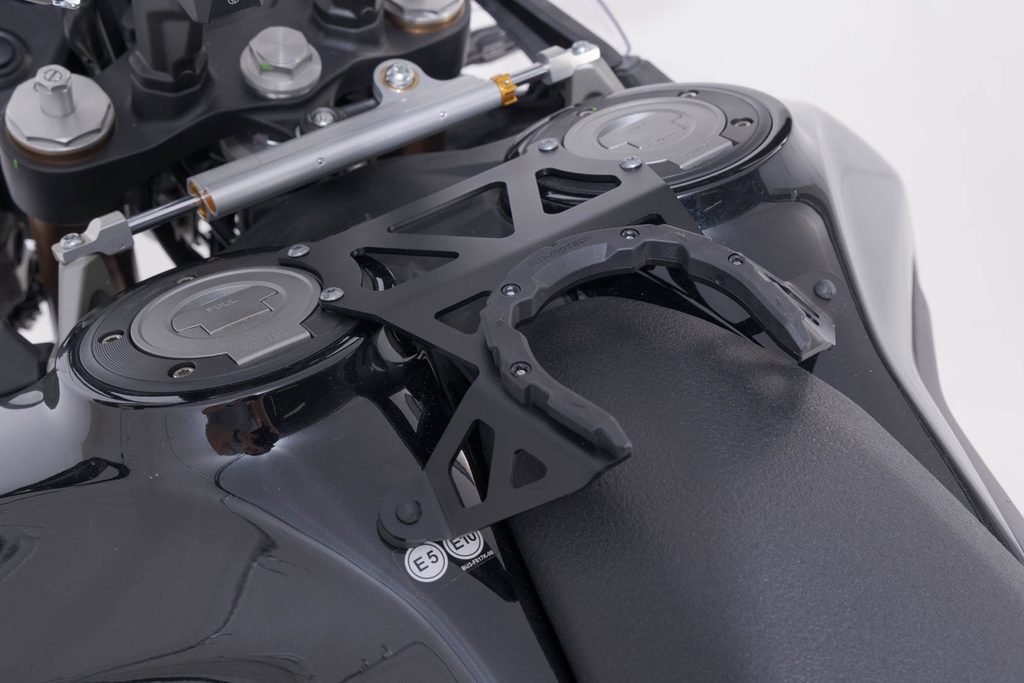 Kroužek nádrže PRO pro Ténéré 700 World Raid je umístěn na montážním prvku specifickém pro motocykl, který je pak připevněn ke dvěma plnicím hrdlům nádrže. Montážní díl je pevně přišroubován k nádrži motocyklu.