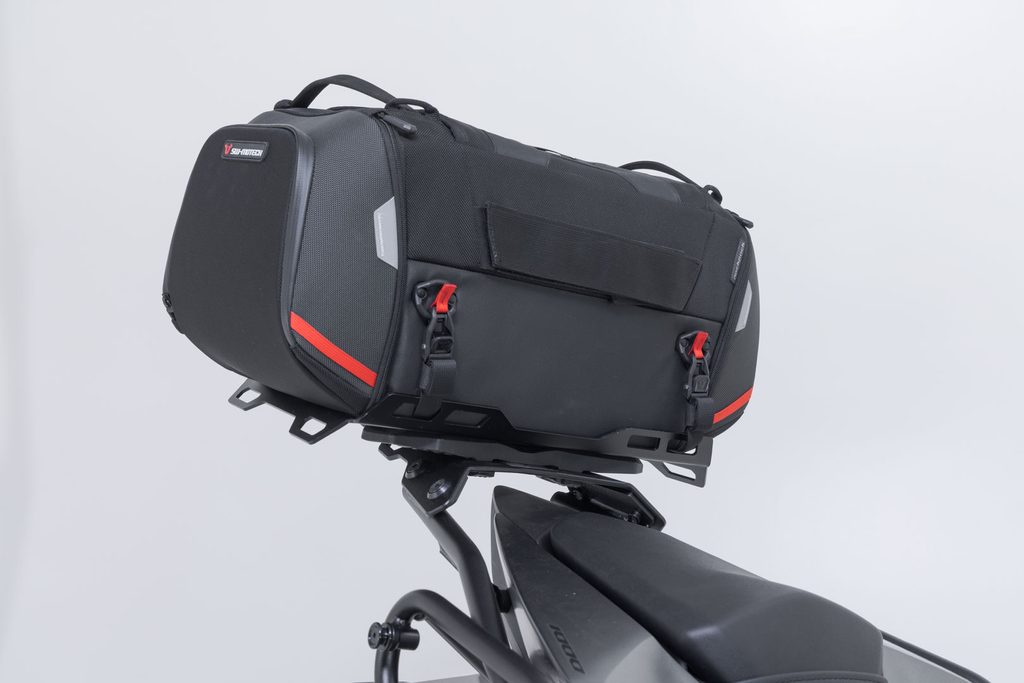 Tail bag ze série PRO je vyroben společností SW-MOTECH z nezničitelného 1680 D Ballistic Nylonu a nosič z robustní hliníkové slitiny. Nosič je připevněn k pružným montážním bodům na motocyklu specifickým pro jízdní kolo.
