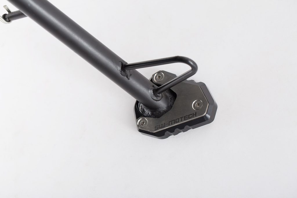 Toto rozšíření bočního stojanu nabízí velkou kontaktní plochu pro zlepšení parkovací stopy motocyklů na drsných površích a měkkém povrchu. Rozšíření je CNC frézováno z vysoce pevné hliníkové slitiny, kombinace eloxovaného hliníku a nerezové oceli poskytuje velkou odolnost za všech klimatických podmínek. Drážkovaná horní římsa pomáhá řidiči snadno vychýlit boční stojan i při nošení těžkých bot.