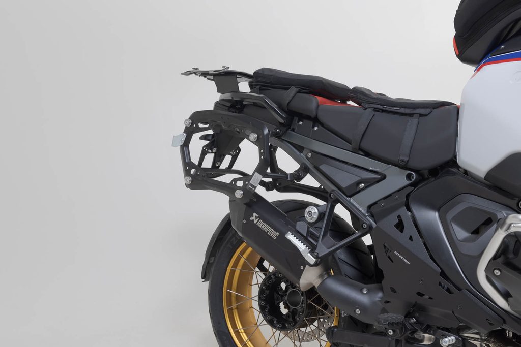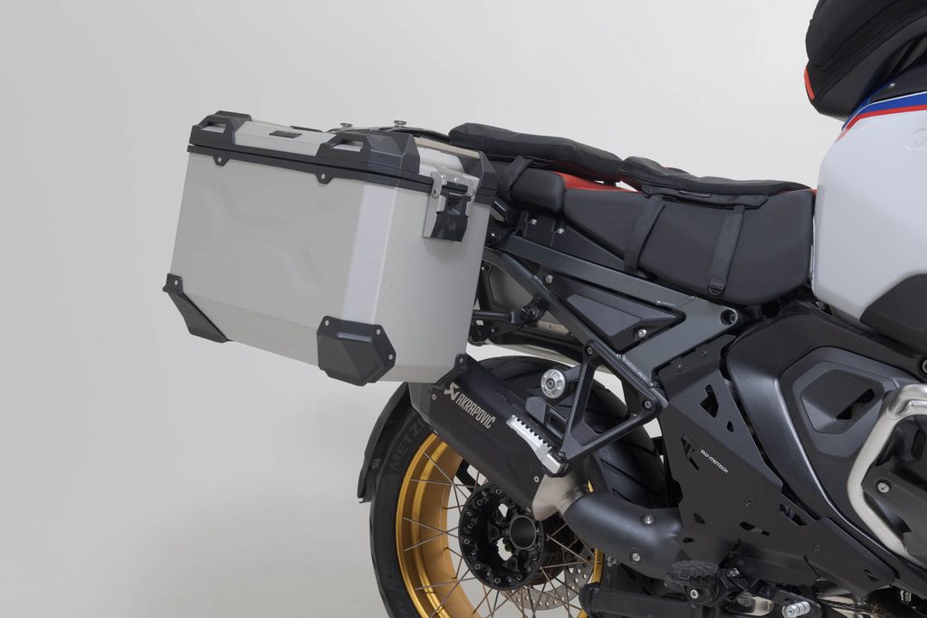 Prémiové se snoubí s prémiovým: společně s Akrapovičem jsme sestavili speciální sadu skládající se z hliníkového systému kufru TRAX ADV v černé barvě a odpovídajícího nasazovacího výfuku Akrapovič pro BMW R 1300 GS. Akrapovič Slip-On zlepšuje výkon BMW R 1300 GS a produkuje typický Akrapovičův zvuk. Zadní tlumič je navíc vysoce kvalitní a vypadá dobře, stejně jako hliníková pouzdra SW-MOTECH z řady TRAX ADV. S trochou zručnosti si můžete násuvný systém sestavit sami a spolu s hliníkovými pouzdry získáte kvalitní sadu. Robustní hliníkové skříně TRAX ADV se dokonale přizpůsobí jakékoli trase: reliéfní vzory podporují stabilitu svařovaného hliníkového stěnového materiálu o tloušťce 1,5 milimetru. Zcela odnímatelné víko s držadly z eloxovaného hliníku a rychloupínacími uzávěrami usnadňuje nakládání a vykládání kufrů na motocykly Zkosená boční hrana zajišťuje vysokou světlou výšku v zatáčkách. S tímto kompletním řešením máte všechny komponenty, které potřebujete, abyste se mohli vydat na dlouhou cestu s TRAX: dvě vodotěsná boční pouzdra TRAX ADV, dva odnímatelné boční nosiče SW-MOTECH, sadu adaptérů, sadu zámků, omezovač víka a ochranu proti krádeži za atraktivní celkovou cenu. Nosiče a velikost kufrů specifické pro daný motocykl jsou navrženy tak, aby dokonale ladily s tvarem zadní části a výfukovým systémem motocyklu. Motocyklový kufr bez kompromisů: Při vývoji TRAX ADV byl kladen důraz na stabilitu a těsnost proti prachu a vodě a také na snadnou manipulaci. Ať už se jedná o dobrodružství v terénu, toulky nebo krátký výlet, prémiová hliníková pouzdra s tloušťkou stěny 1,5 milimetru se osvědčí v každé výzvě.